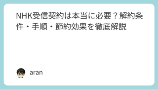 サブスク費 NHK受信契約は本当に必要?解約条件・手順・節約効果を徹底解説 NHK受信契約は本当に必要?テレビを見ない一人暮らしサラリーマン向けに、解約条件・手順・年間2万円以上の節約効果をFIRE達成者が解説します。 2025.12.13 サブスク費